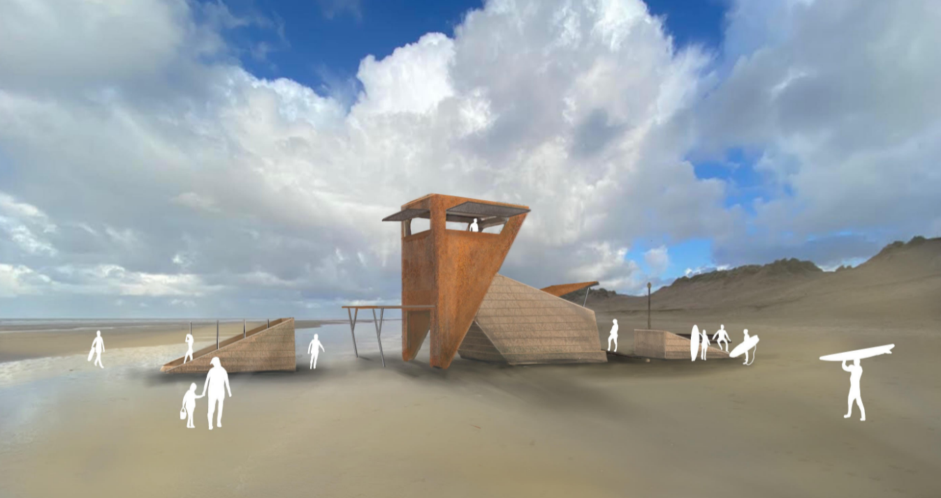 Lifeguard Tower: An elevated space/structure with good views to observe the coast and be a highly visible public point of safety and first-aid for this stretch of Beach.